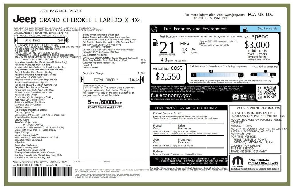 2024 Jeep Grand Cherokee L Laredo Recent Arrival! We want you to shop confidently for your next used car at D-Patrick Boonville Ford and We make it EASY! Buy this used vehicle 100% online or in-store, EASY. Saving time at the dealership, EASY! Financing, EASY! Finding the car you love at the price you want, EASY! This pre-owned vehicle was put through an extensive inspection before hitting our lot. Because of this, we are able to offer a 3-month/3,000-mile comprehensive limited warranty. You also get our Love It or Return It 5-day, 300-mile Exchange Policy. See our website for more details on both. We also offer extended service plans, vehicle protection plans, and offer a CarFax vehicle history report. *Prices listed do not include a $250 documentation fee, applicable tax, title, tags, license, or $195 service and preparation. All pricing, vehicle information, and features (such as accessories and color) are believed to be accurate, but we do not warrant or guarantee such accuracy. The prices shown above may vary from region to region, and incentives are subject to change. Some offers listed may not be available to all customers. All online sale commitments are subject to confirmation of continued availability of vehicle. Once availability is confirmed, online sale agreement becomes binding upon the parties. If any information found on the website is thought to be erroneous, please verify information with a customer service representative. See dealer for full details. Looking to sell your current vehicle? We buy cars for cash. 3.45 Rear Axle Ratio, 3rd row seats: split-bench, 4-Wheel Disc Brakes, 6 Speakers, ABS brakes, Air Conditioning, Alloy wheels, Anti-whiplash front head restraints, Automatic temperature control, Brake assist, Bumpers: body-color, Cloth Seats, Compass, Delay-off headlights, Driver door bin, Driver vanity mirror, Dual front impact airbags, Dual front side impact airbags, Electronic Stability Control, Emergency communication system, Four wheel independent suspension, Front anti-roll bar, Front Bucket Seats, Front Center Armrest w/Storage, Front dual zone A/C, Front reading lights, Fully automatic headlights, Heated door mirrors, Illuminated entry, Knee airbag, Low tire pressure warning, Manual Fold Seatbacks, Normal Duty Suspension, Occupant sensing airbag, Outside temperature display, Overhead airbag, Overhead console, Panic alarm, ParkView Rear Back-Up Camera, Passenger door bin, Passenger vanity mirror, Power door mirrors, Power driver seat, Power steering, Power windows, Quick Order Package 23D Laredo X, Radio data system, Radio: Uconnect 5 w/8.4 Display, Rear air conditioning, Rear anti-roll bar, Rear reading lights, Rear window defroster, Rear window wiper, Reclining 3rd row seat, Remote keyless entry, Security system, Speed control, Speed-Sensitive Wipers, Split folding rear seat, Spoiler, Steering wheel mounted audio controls, Tachometer, Telescoping steering wheel, Tilt steering wheel, Traction control, Trip computer, Variably intermittent wipers, Voltmeter, Wheels: 18 x 8.0 Fully Painted Aluminum. CARFAX One-Owner. 4D Sport Utility Laredo 8-Speed Automatic 3.6L V6 24V VVT 4WD Baltic Gray Metallic Clearcoat CALL US TODAY BEFORE THIS ONE GETS AWAY-- (812) 897-5838 or shop online at www.boonvilleford.com.