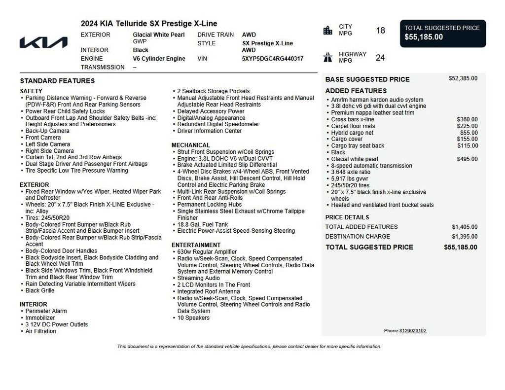 2024 Kia Telluride SX-Prestige X-Line Recent Arrival! We want you to shop confidently for your next used car at D-Patrick Lebanon Ford and We make it EASY! Buy this used vehicle 100% online or in-store, EASY. Saving time at the dealership, EASY! Financing, EASY! Get pre-approved online or in-store with one of our many lenders, EASY. Finding the car you love at the price you want, EASY! This pre-owned vehicle was put through an extensive inspection before hitting our lot. Because of this, we are able to offer a 3-month/3,000-mile comprehensive limited warranty. You also get our Love It or Return It 5-day, 300-mile Exchange Policy. See our website for more details on both. We also offer extended service plans, vehicle protection plans, and offer a free to you CarFax vehicle history report. *Prices listed do not include a $250 documentation fee, applicable tax, title, tags, license, or $195 service and preparation. All pricing, vehicle information, and features (such as accessories and color) are believed to be accurate, but we do not warrant or guarantee such accuracy. The prices shown above may vary from region to region, and incentives are subject to change. Some offers listed may not be available to all customers. All online sale commitments are subject to confirmation of continued availability of vehicle. Once availability is confirmed, online sale agreement becomes binding upon the parties. If any information found on the website is thought to be erroneous, please verify information with a customer service representative. See dealer for full details. Looking to sell your current vehicle? We buy cars for cash. 10 Speakers, 3.648 Axle Ratio, 3rd row seats: split-bench, 4-Wheel Disc Brakes, ABS brakes, Air Conditioning, Alloy wheels, AM/FM radio: SiriusXM, Apple CarPlay & Android Auto, Auto High-beam Headlights, Auto-dimming Rear-View mirror, Automatic temperature control, Brake assist, Bumpers: body-color, Cargo Cover, Cargo Tray Seat Back, Carpet Floor Mats, Compass, Delay-off headlights, Driver door bin, Driver vanity mirror, Dual front impact airbags, Dual front side impact airbags, Electronic Stability Control, Emergency communication system: 911 Connect, Exterior Parking Camera Rear, Four wheel independent suspension, Front anti-roll bar, Front Bucket Seats, Front Center Armrest, Front dual zone A/C, Front fog lights, Front reading lights, Fully automatic headlights, Garage door transmitter: HomeLink, harman/kardon® Speakers, Heated & Ventilated Front Bucket Seats, Heated door mirrors, Heated front seats, Heated steering wheel, Hybrid Cargo Net, Illuminated entry, Knee airbag, Leather Shift Knob, Leather steering wheel, Low tire pressure warning, Memory seat, Navigation System, Occupant sensing airbag, Outside temperature display, Overhead airbag, Overhead console, Panic alarm, Passenger door bin, Passenger vanity mirror, Power door mirrors, Power driver seat, Power Liftgate, Power moonroof, Power passenger seat, Power steering, Power windows, Radio data system, Radio: AM/FM Harman Kardon Audio System, Rear air conditioning, Rear anti-roll bar, Rear audio controls, Rear reading lights, Rear side impact airbag, Rear window defroster, Rear window wiper, Reclining 3rd row seat, Remote keyless entry, Roof rack: rails only, Security system, Smart Key w/ Push Button and Remote Start, Speed control, Speed-sensing steering, Split folding rear seat, Spoiler, Steering wheel mounted audio controls, Tachometer, Telescoping steering wheel, Tilt steering wheel, Traction control, Trip computer, Turn signal indicator mirrors, Variably intermittent wipers, Ventilated front seats. CARFAX One-Owner. Clean CARFAX. 4D Sport Utility SX-Prestige X-Line 8-Speed Automatic 3.8L V6 DOHC AWD Glacial White Pearl CALL US TODAY BEFORE THIS ONE GETS AWAY-- (765) 204-6248 or shop online at www.dpatricklebanonford.com.