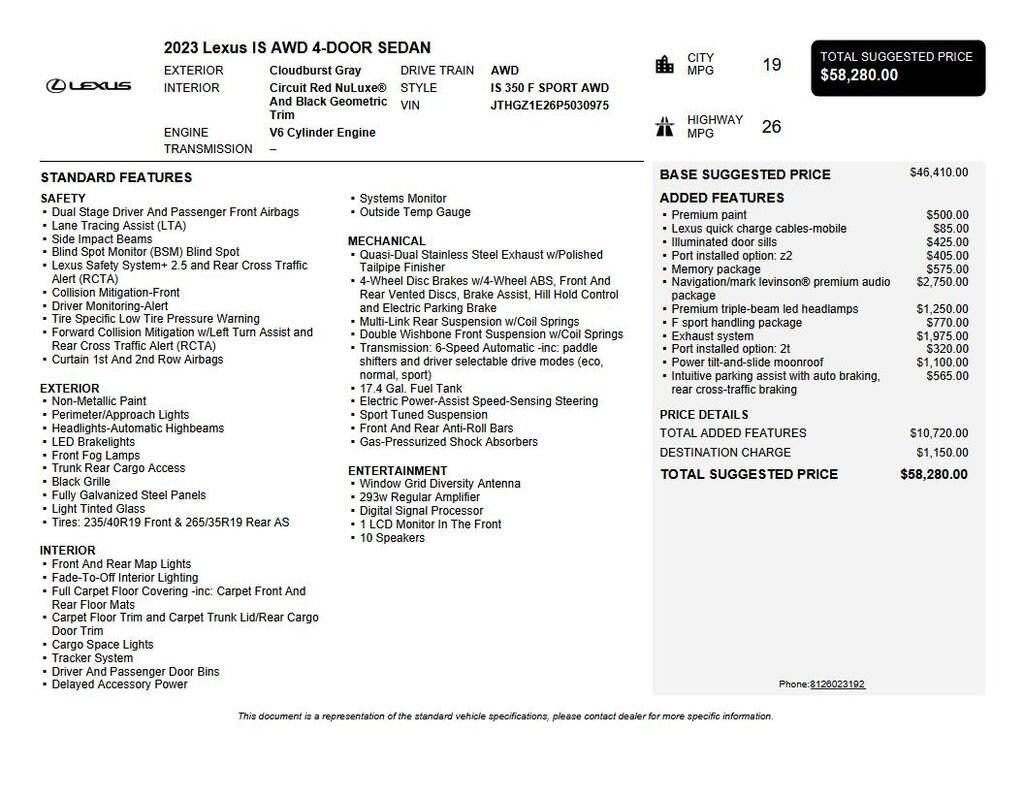 2023 Lexus IS 350 F SPORT We want you to shop confidently for your next used car at The BIG Ford Store, D-Patrick Ford. We are located on Highway 41 and Walnut in Evansville, right next to the Lloyd Expressway. Buy this used vehicle 100% online or in-store. This pre-owned vehicle was put through an extensive inspection before hitting our lot. Because of this, we are able to offer a 3-month/3,000-mile comprehensive limited warranty. You also get our Love It or Return It 5-day, 300-mile Exchange Policy. See our website for more details on both. We also offer extended service plans, vehicle protection plans, and offer a CarFax vehicle history report. *Prices listed do not include a $250 documentation fee, applicable tax, title, tags, license, or $195 service and preparation. All pricing, vehicle information, and features (such as accessories and color) are believed to be accurate, but we do not warrant or guarantee such accuracy. The prices shown above may vary from region to region, and incentives are subject to change. Some offers listed may not be available to all customers. All online sale commitments are subject to confirmation of continued availability of vehicle. Once availability is confirmed, online sale agreement becomes binding upon the parties. If any information found on the website is thought to be erroneous, please verify information with a customer service representative. See dealer for full details. Looking to sell your current vehicle? We buy cars for cash. Every test drive at D-Patrick Ford in Evansville earns $10 to a local charity. Schedule your test drive today! AWD, 10 Speakers, 4-Wheel Disc Brakes, ABS brakes, Air Conditioning, Alloy wheels, AM/FM radio: SiriusXM, Apple CarPlay/Android Auto, Auto High-beam Headlights, Auto-dimming door mirrors, Auto-dimming Rear-View mirror, Automatic temperature control, Brake assist, Bumpers: body-color, CD player, Compass, Delay-off headlights, Driver door bin, Driver vanity mirror, Dual front impact airbags, Dual front side impact airbags, Electronic Stability Control, Emergency communication system: Safety Connect (3-year trial), Exterior Parking Camera Rear, Four wheel independent suspension, Front anti-roll bar, Front Bucket Seats, Front Center Armrest, Front dual zone A/C, Front fog lights, Front reading lights, Fully automatic headlights, Garage door transmitter: HomeLink, Heated & Ventilated F SPORT Seats, Heated door mirrors, Heated front seats, Heated steering wheel, Illuminated entry, Knee airbag, Leather Shift Knob, Low tire pressure warning, Occupant sensing airbag, Outside temperature display, Overhead airbag, Overhead console, Panic alarm, Passenger door bin, Passenger vanity mirror, Perforated NuLuxe Seat Trim (EA), Power door mirrors, Power driver seat, Power passenger seat, Power steering, Power windows, Radio data system, Radio: Multimedia System w/8 Color Touchscreen, Rain sensing wipers, Rear anti-roll bar, Rear reading lights, Rear seat center armrest, Rear side impact airbag, Rear window defroster, Remote keyless entry, Security system, Speed control, Speed-sensing steering, Speed-Sensitive Wipers, Split folding rear seat, Spoiler, Sport steering wheel, Steering wheel mounted audio controls, Tachometer, Telescoping steering wheel, Tilt steering wheel, Traction control, Trip computer, Turn signal indicator mirrors, Variably intermittent wipers, Ventilated front seats, AWD. CARFAX One-Owner. Clean CARFAX. 4D Sedan 350 F SPORT 6-Speed Automatic 3.5L V6 DOHC Dual VVT-i 24V AWD Gray CALL TODAY (812) 625-4823 OR SHOP ONLINE AT WWW.DPATRICKFORD.COM.
