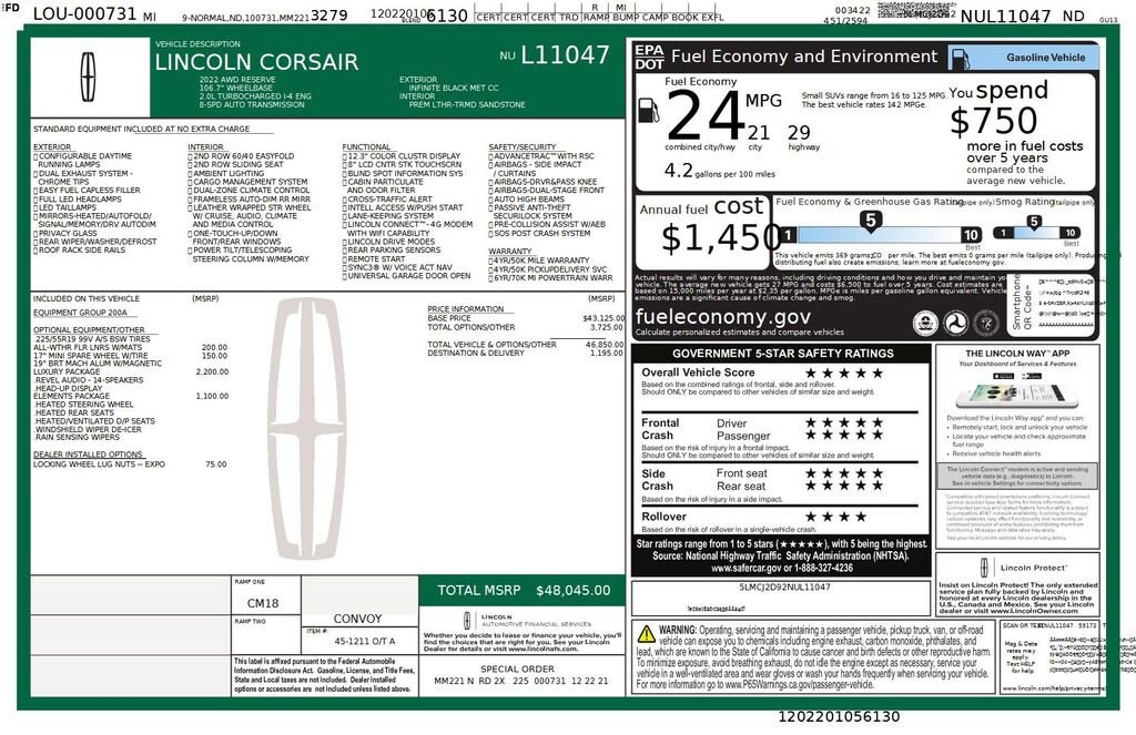 2022 Lincoln Corsair Reserve We want you to shop confidently for your next used car at The BIG Ford Store, D-Patrick Ford. We are located on Highway 41 and Walnut in Evansville, right next to the Lloyd Expressway. Buy this used vehicle 100% online or in-store. This pre-owned vehicle was put through an extensive inspection before hitting our lot. Because of this, we are able to offer a 3-month/3,000-mile comprehensive limited warranty. You also get our Love It or Return It 5-day, 300-mile Exchange Policy. See our website for more details on both. We also offer extended service plans, vehicle protection plans, and offer a free to you CarFax vehicle history report. *Prices listed do not include a $250 documentation fee, applicable tax, title, tags, license, or $195 service and preparation. All pricing, vehicle information, and features (such as accessories and color) are believed to be accurate, but we do not warrant or guarantee such accuracy. The prices shown above may vary from region to region, and incentives are subject to change. Some offers listed may not be available to all customers. All online sale commitments are subject to confirmation of continued availability of vehicle. Once availability is confirmed, online sale agreement becomes binding upon the parties. If any information found on the website is thought to be erroneous, please verify information with a customer service representative. See dealer for full details. Looking to sell your current vehicle? We buy cars for cash. Every test drive at D-Patrick Ford in Evansville earns $10 to a local charity. Schedule your test drive today! 10 Speakers, 19 Bright Machined Aluminum Wheels, 3.81 Axle Ratio, 4-Wheel Disc Brakes, ABS brakes, Air Conditioning, All-Weather Floor Liners w/Fr&Rr Carpet Floor Mats, Alloy wheels, AM/FM radio: SiriusXM, Auto High-beam Headlights, Auto tilt-away steering wheel, Auto-dimming door mirrors, Auto-dimming Rear-View mirror, Automatic temperature control, Brake assist, Bumpers: body-color, Compass, Delay-off headlights, Driver door bin, Driver vanity mirror, Dual front impact airbags, Dual front side impact airbags, Electronic Stability Control, Elements Package, Emergency communication system: 911 Assist, Equipment Group 200A, Four wheel independent suspension, Front anti-roll bar, Front Bucket Seats, Front Center Armrest, Front dual zone A/C, Front reading lights, Fully automatic headlights, Garage door transmitter, Heads-Up Display, Heated door mirrors, Heated front seats, Heated Rear Seat, Heated Steering Wheel, Heated/Ventilated Driver & Front Passenger Seats, Illuminated entry, Knee airbag, Leather steering wheel, Low tire pressure warning, Luxury Package, Memory seat, Navigation System, Occupant sensing airbag, Outside temperature display, Overhead airbag, Overhead console, Panic alarm, Passenger door bin, Passenger vanity mirror, Power door mirrors, Power driver seat, Power Liftgate, Power passenger seat, Power steering, Power windows, Premium Leather Heated Comfort Seats, Radio data system, Radio: Lincoln Premium Audio System w/MP3, Radio: Revel Audio System w/HD Radio & MP3, Rain Sensing Wipers, Rear anti-roll bar, Rear Parking Sensors, Rear reading lights, Rear seat center armrest, Rear window defroster, Rear window wiper, Remote keyless entry, Roof rack: rails only, Security system, SiriusXM Radio, Speed control, Speed-sensing steering, Speed-Sensitive Wipers, Split folding rear seat, Spoiler, Steering wheel memory, Steering wheel mounted A/C controls, Steering wheel mounted audio controls, SYNC 3 Communications & Entertainment System, Tachometer, Telescoping steering wheel, Tilt steering wheel, Traction control, Trip computer, Turn signal indicator mirrors, Variably intermittent wipers, Windshield Wiper De-Icer. CARFAX One-Owner. 4D Sport Utility Reserve 8-Speed Automatic 2.0L I4 AWD Black Metallic CALL TODAY (812) 625-4823 OR SHOP ONLINE AT WWW.DPATRICKFORD.COM.
