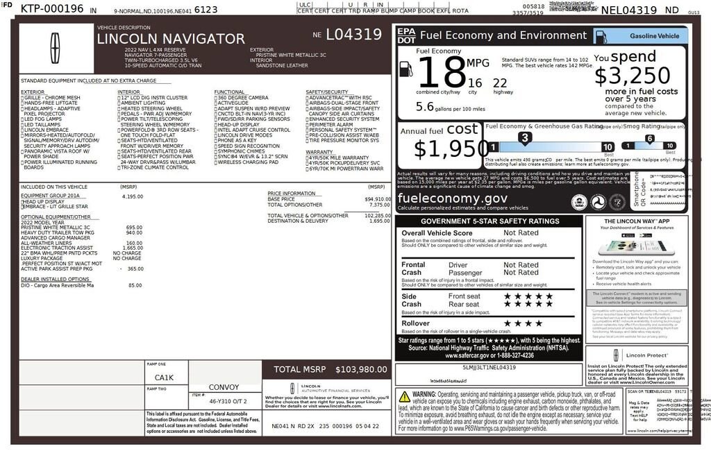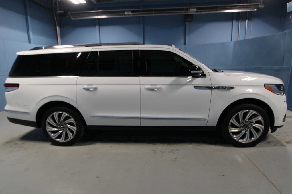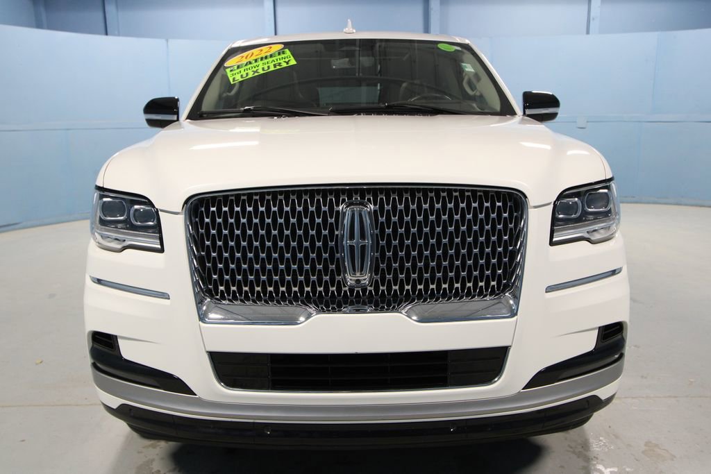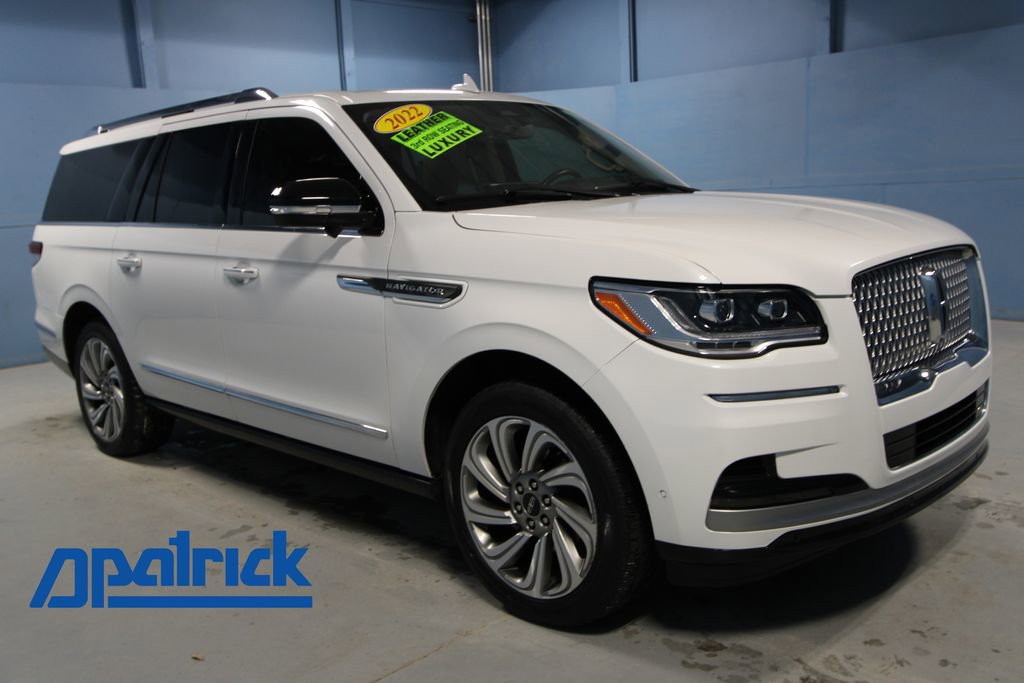 2022 Lincoln Navigator L L Reserve We want you to shop confidently for your next used car at The BIG Ford Store, D-Patrick Ford. We are located on Highway 41 and Walnut in Evansville, right next to the Lloyd Expressway. Buy this used vehicle 100% online or in-store. This pre-owned vehicle was put through an extensive inspection before hitting our lot. Because of this, we are able to offer a 3-month/3,000-mile comprehensive limited warranty. You also get our Love It or Return It 5-day, 300-mile Exchange Policy. See our website for more details on both. We also offer extended service plans, vehicle protection plans, and offer a CarFax vehicle history report. *Prices listed do not include a $250 documentation fee, applicable tax, title, tags, license, or $195 service and preparation. All pricing, vehicle information, and features (such as accessories and color) are believed to be accurate, but we do not warrant or guarantee such accuracy. The prices shown above may vary from region to region, and incentives are subject to change. Some offers listed may not be available to all customers. All online sale commitments are subject to confirmation of continued availability of vehicle. Once availability is confirmed, online sale agreement becomes binding upon the parties. If any information found on the website is thought to be erroneous, please verify information with a customer service representative. See dealer for full details. Looking to sell your current vehicle? We buy cars for cash. Every test drive at D-Patrick Ford in Evansville earns $10 to a local charity. Schedule your test drive today! 14 Speakers, 3.73 Axle Ratio, 3rd row seats: split-bench, 4-Wheel Disc Brakes, ABS brakes, Active Park Assist 2.0 Prep Kit, Adaptive suspension, Adjustable pedals, Air Conditioning, All-Weather Floor Liners w/o Carpet Floor Mats, Alloy wheels, AM/FM radio: SiriusXM with 360L, Audio memory, Auto High-beam Headlights, Auto Start-Stop Technology, Auto tilt-away steering wheel, Auto-dimming door mirrors, Auto-dimming Rear-View mirror, Auto-leveling suspension, Automatic temperature control, Bodyside moldings, Brake assist, Bumpers: body-color, Cargo Area Reversible Mat, Class IV w/4-Pin & 7-Pin Connectors, Compass, Delay-off headlights, Driver door bin, Driver vanity mirror, Driver's Seat Mounted Armrest, Dual front impact airbags, Dual front side impact airbags, Electronic Stability Control, Electronic Traction Assist (eLSD), Emergency communication system: 911 Assist, Equipment Group 201A Reserve I, Exterior Parking Camera Rear, Four wheel independent suspension, Front anti-roll bar, Front Bucket Seats, Front dual zone A/C, Front fog lights, Front reading lights, Front Tow Hooks, Fully automatic headlights, Garage door transmitter, Genuine wood dashboard insert, Genuine wood door panel insert, Head restraints memory, Heads-Up Display, Heated door mirrors, Heated front seats, Heated rear seats, Heated steering wheel, Heavy-Duty Trailer Tow Package, HVAC memory, Illuminated 1st & 2nd Row Seat Belts, Illuminated entry, Leather steering wheel, Lincoln Lit Star in Grille, Low tire pressure warning, Luxury Package, Memory seat, Navigation system: Connected Navigation (3-year trial), Occupant sensing airbag, Outside temperature display, Overhead airbag, Overhead console, Panic alarm, Passenger door bin, Passenger seat mounted armrest, Passenger vanity mirror, Pedal memory, Perfect Position Seats (30-Way) w/Active Motion, Power adjustable rear head restraints, Power door mirrors, Power driver seat, Power Liftgate, Power moonroof: Panoramic Vista Roof, Power passenger seat, Power steering, Power windows, Prem Lthr Auto Htd/Ventiltd Perfect Position Seats, Pro-Trailer Backup Assist 2.0, Radio data system, Radio: Revel AM/FM/HD/MP3 Audio System, Rain sensing wipers, Rear air conditioning, Rear anti-roll bar, Rear audio controls, Rear reading lights, Rear window defroster, Rear window wiper, Reclining 3rd row seat, Remote keyless entry, Revel Ultima 3D Au