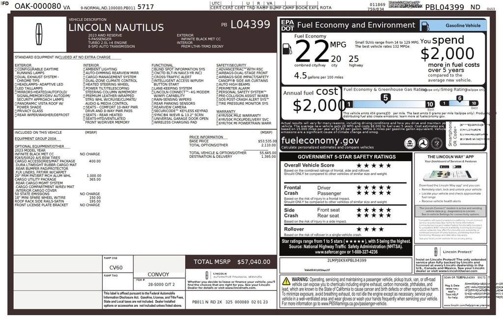 2023 Lincoln Nautilus Reserve We want you to shop confidently for your next used car at The BIG Ford Store, D-Patrick Ford. We are located on Highway 41 and Walnut in Evansville, right next to the Lloyd Expressway. Buy this used vehicle 100% online or in-store. This pre-owned vehicle was put through an extensive inspection before hitting our lot. Because of this, we are able to offer a 3-month/3,000-mile comprehensive limited warranty. You also get our Love It or Return It 5-day, 300-mile Exchange Policy. See our website for more details on both. We also offer extended service plans, vehicle protection plans, and offer a CarFax vehicle history report. *Prices listed do not include a $250 documentation fee, applicable tax, title, tags, license, or $195 service and preparation. All pricing, vehicle information, and features (such as accessories and color) are believed to be accurate, but we do not warrant or guarantee such accuracy. The prices shown above may vary from region to region, and incentives are subject to change. Some offers listed may not be available to all customers. All online sale commitments are subject to confirmation of continued availability of vehicle. Once availability is confirmed, online sale agreement becomes binding upon the parties. If any information found on the website is thought to be erroneous, please verify information with a customer service representative. See dealer for full details. Looking to sell your current vehicle? We buy cars for cash. Every test drive at D-Patrick Ford in Evansville earns $10 to a local charity. Schedule your test drive today! 10 Speakers, 110V/150W AC Power Outlet, 3.80 Axle Ratio, 4-Wheel Disc Brakes, ABS brakes, Air Conditioning, Alexa Built-In, All-Weather Floor Liners w/Carpet Mats, Alloy wheels, AM/FM radio: SiriusXM with 360L, Auto High-beam Headlights, Auto tilt-away steering wheel, Auto-dimming door mirrors, Auto-dimming Rear-View mirror, Automatic temperature control, Brake assist, Bumpers: body-color, Cargo Accessories & Mat Package, Cargo Compartment w/Reversible Mat, Cargo Utility Package, Compass, Delay-off headlights, Driver door bin, Driver vanity mirror, Dual front impact airbags, Dual front side impact airbags, Durable Lightweight Rubber Cargo Mat, Electronic Stability Control, Emergency communication system: 911 Assist, Equipment Group 200A, Four wheel independent suspension, Front anti-roll bar, Front Bucket Seats, Front Center Armrest w/Storage, Front dual zone A/C, Front reading lights, Fully automatic headlights, Garage door transmitter: HomeLink, Heated door mirrors, Heated front seats, Heated rear seats, Heated steering wheel, Illuminated entry, Interior Cargo Cover, Knee airbag, Leather steering wheel, Low tire pressure warning, Memory seat, Molded Plastic Storage Bins, Navigation System, Occupant sensing airbag, Outside temperature display, Overhead airbag, Overhead console, Panic alarm, Passenger door bin, Passenger vanity mirror, Power door mirrors, Power driver seat, Power Liftgate, Power moonroof: Panoramic Vista Roof, Power passenger seat, Power steering, Power windows, Premium Lthr-Trmmd Heated/Ventilated Comfort Seats, Radio data system, Radio: AM/FM/HD Audio System, Rain sensing wipers, Rear anti-roll bar, Rear Bumper Anti-Scratch Pad/Load Protector, Rear Cargo Management System, Rear reading lights, Rear seat center armrest, Rear window defroster, Rear window wiper, Remote keyless entry, Satin Roof Rack Side Rails w/o Crossbars, Security system, Speed control, Speed-sensing steering, Speed-Sensitive Wipers, Split folding rear seat, Spoiler, Steering wheel memory, Steering wheel mounted A/C controls, Steering wheel mounted audio controls, SYNC 4 w/Enhanced Voice Recognition, Tachometer, Telescoping steering wheel, Tilt steering wheel, Traction control, Trip computer, Turn signal indicator mirrors, Variably intermittent wipers, Ventilated front seats, Wheels: 18 Premium Painted Bright Machined Alum, Wheels: 20 Prem Painted Bright Mac
