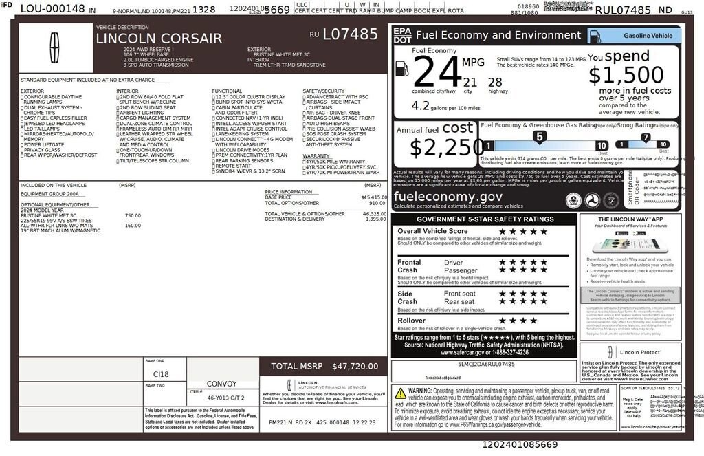 2024 Lincoln Corsair Reserve Recent Arrival! We want you to shop confidently for your next used car at The BIG Ford Store, D-Patrick Ford. We are located on Highway 41 and Walnut in Evansville, right next to the Lloyd Expressway. Buy this used vehicle 100% online or in-store. This pre-owned vehicle was put through an extensive inspection before hitting our lot. Because of this, we are able to offer a 3-month/3,000-mile comprehensive limited warranty. You also get our Love It or Return It 5-day, 300-mile Exchange Policy. See our website for more details on both. We also offer extended service plans, vehicle protection plans, and offer a CarFax vehicle history report. *Prices listed do not include a $250 documentation fee, applicable tax, title, tags, license, or $195 service and preparation. All pricing, vehicle information, and features (such as accessories and color) are believed to be accurate, but we do not warrant or guarantee such accuracy. The prices shown above may vary from region to region, and incentives are subject to change. Some offers listed may not be available to all customers. All online sale commitments are subject to confirmation of continued availability of vehicle. Once availability is confirmed, online sale agreement becomes binding upon the parties. If any information found on the website is thought to be erroneous, please verify information with a customer service representative. See dealer for full details. Looking to sell your current vehicle? We buy cars for cash. Every test drive at D-Patrick Ford in Evansville earns $10 to a local charity. Schedule your test drive today! 19 Bright Machined Aluminum Wheels, 3.81 Axle Ratio, 4-Wheel Disc Brakes, 9 Speakers, ABS brakes, Air Conditioning, Alexa Built-In, All-Weather Floor Liners, Alloy wheels, AM/FM radio: SiriusXM, Apple CarPlay/Android Auto, Auto High-beam Headlights, Auto-dimming Rear-View mirror, Automatic temperature control, Brake assist, Bumpers: body-color, Compass, Delay-off headlights, Driver door bin, Driver vanity mirror, Dual front impact airbags, Dual front side impact airbags, Electronic Stability Control, Emergency communication system: 911 Assist, Equipment Group 200A, Four wheel independent suspension, Front anti-roll bar, Front Bucket Seats, Front Center Armrest, Front dual zone A/C, Front reading lights, Fully automatic headlights, Heated door mirrors, Heated front seats, Illuminated entry, Knee airbag, Lane Departure Warning System, Leather steering wheel, Low tire pressure warning, Memory seat, Navigation system: Connected Navigation (3-year trial), Occupant sensing airbag, Outside temperature display, Overhead airbag, Overhead console, Panic alarm, Passenger door bin, Passenger vanity mirror, Power door mirrors, Power driver seat, Power Liftgate, Power passenger seat, Power steering, Power windows, Premium Leather-Trimmed Heated Captain's Chairs, Radio data system, Radio: Lincoln Premium Audio System w/MP3, Rear anti-roll bar, Rear Parking Sensors, Rear reading lights, Rear seat center armrest, Rear window defroster, Rear window wiper, Remote keyless entry, Roof rack: rails only, Security system, SiriusXM Radio, Speed control, Speed-sensing steering, Speed-Sensitive Wipers, Split folding rear seat, Spoiler, Steering wheel mounted A/C controls, Steering wheel mounted audio controls, SYNC 4 Communications & Entertainment System, Tachometer, Telescoping steering wheel, Tilt steering wheel, Traction control, Trip computer, Variably intermittent wipers. CARFAX One-Owner. Clean CARFAX. 4D Sport Utility Reserve 8-Speed Automatic 2.0L I4 AWD Pristine White Metallic Tri-Coat CALL TODAY (812) 625-4823 OR SHOP ONLINE AT WWW.DPATRICKFORD.COM.