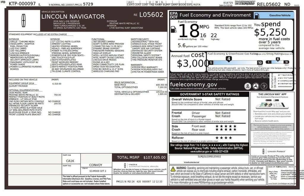 2024 Lincoln Navigator L L Reserve We want you to shop confidently for your next used car at The BIG Ford Store, D-Patrick Ford. We are located on Highway 41 and Walnut in Evansville, right next to the Lloyd Expressway. Buy this used vehicle 100% online or in-store. This pre-owned vehicle was put through an extensive inspection before hitting our lot. Because of this, we are able to offer a 3-month/3,000-mile comprehensive limited warranty. You also get our Love It or Return It 5-day, 300-mile Exchange Policy. See our website for more details on both. We also offer extended service plans, vehicle protection plans, and offer a CarFax vehicle history report. *Prices listed do not include a $250 documentation fee, applicable tax, title, tags, license, or $195 service and preparation. All pricing, vehicle information, and features (such as accessories and color) are believed to be accurate, but we do not warrant or guarantee such accuracy. The prices shown above may vary from region to region, and incentives are subject to change. Some offers listed may not be available to all customers. All online sale commitments are subject to confirmation of continued availability of vehicle. Once availability is confirmed, online sale agreement becomes binding upon the parties. If any information found on the website is thought to be erroneous, please verify information with a customer service representative. See dealer for full details. Looking to sell your current vehicle? We buy cars for cash. Every test drive at D-Patrick Ford in Evansville earns $10 to a local charity. Schedule your test drive today! 14 Speakers, 2nd Row Heated/Ventilated 40/Console/40 Seat, 3.73 Axle Ratio, 3rd row seats: split-bench, 4-Wheel Disc Brakes, ABS brakes, Adaptive suspension, Adjustable pedals, Air Conditioning, All-Weather Floor Liners w/Carpet Floor Mats, Alloy wheels, AM/FM radio: SiriusXM with 360L, Apple CarPlay/Android Auto, Audio memory, Auto High-beam Headlights, Auto Start-Stop Technology, Auto tilt-away steering wheel, Auto-dimming door mirrors, Auto-dimming Rear-View mirror, Auto-leveling suspension, Automatic temperature control, Bodyside moldings, Brake assist, Bumpers: body-color, Compass, Delay-off headlights, Driver door bin, Driver vanity mirror, Driver's Seat Mounted Armrest, Dual front impact airbags, Dual front side impact airbags, Electronic Stability Control, Emergency communication system: 911 Assist, Equipment Group 201A Reserve I, Exterior Parking Camera Rear, Four wheel independent suspension, Front anti-roll bar, Front Bucket Seats, Front dual zone A/C, Front fog lights, Front reading lights, Fully automatic headlights, Garage door transmitter, Genuine wood dashboard insert, Genuine wood door panel insert, Head restraints memory, Heads-Up Display, Heated door mirrors, Heated front seats, Heated rear seats, Heated steering wheel, HVAC memory, Illuminated 1st & 2nd Row Seat Belts, Illuminated entry, Lane Departure Warning System, Leather steering wheel, Lincoln Lit Star in Grille, Low tire pressure warning, Luxury Package, Memory seat, Navigation system: Connected Navigation (1-year trial), Occupant sensing airbag, Outside temperature display, Overhead airbag, Overhead console, Panic alarm, Passenger door bin, Passenger seat mounted armrest, Passenger vanity mirror, Pedal memory, Perfect Position Seats (30-Way) w/Active Motion, Power adjustable rear head restraints, Power door mirrors, Power driver seat, Power Liftgate, Power moonroof: Panoramic Vista Roof, Power passenger seat, Power steering, Power windows, Prem Lthr Auto Htd/Ventiltd Perfect Position Seats, Radio data system, Radio: Revel Audio System w/Satelllite/AM/FM/HD, Radio: Revel Ultima 3D Audio System w/28 Speakers, Rain sensing wipers, Rear air conditioning, Rear anti-roll bar, Rear audio controls, Rear reading lights, Rear window defroster, Rear window wiper, Reclining 3rd row seat, Remote keyless entry, Security system, SiriusXM w/360L, Speed control, Speed-sensing stee