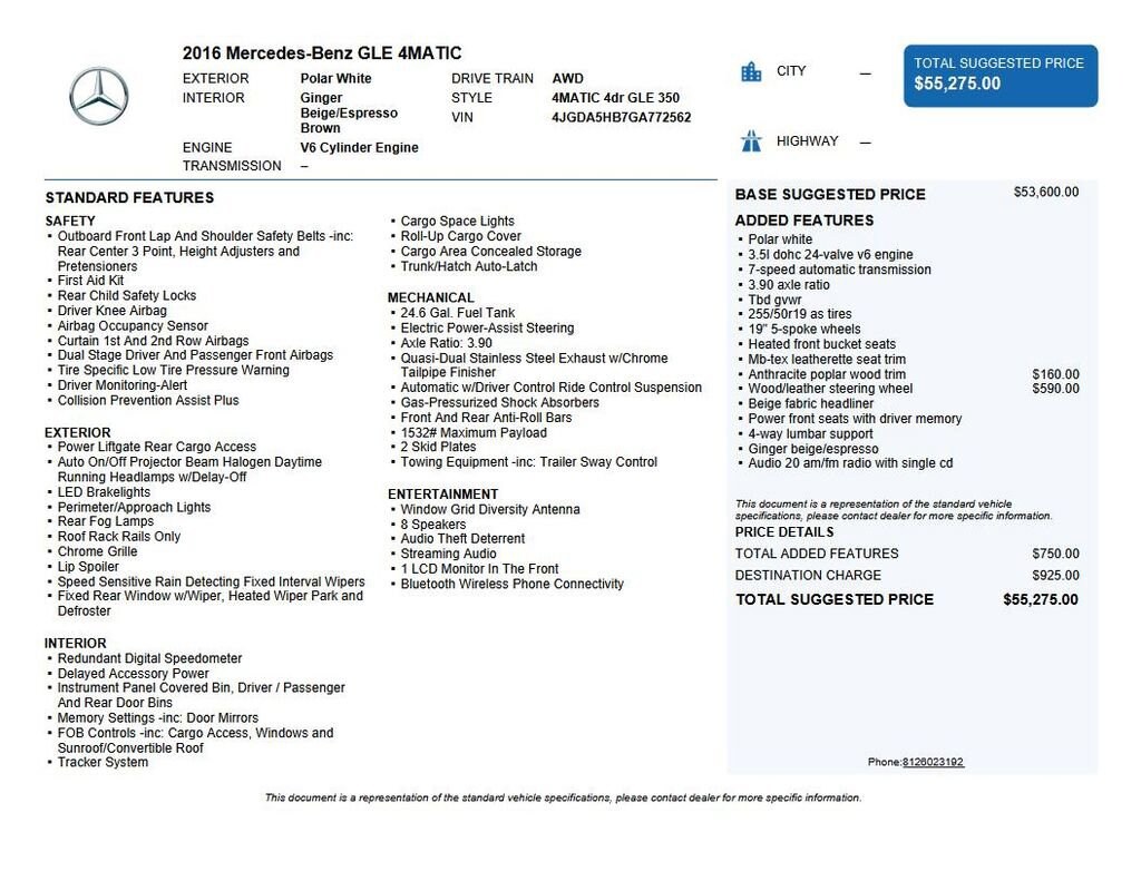 2016 Mercedes-Benz GLE 350 4MATIC® Recent Arrival! VEHICLE SOLD AS-IS. We want you to shop confidently for your next used car at The BIG Ford Store, D-Patrick Ford. We are located on Highway 41 and Walnut in Evansville, right next to the Lloyd Expressway. This vehicle’s low price is reflective of its age, condition, and mileage and we do not warrant its mechanical or overall condition. This vehicle is provided with a CarFax vehicle history report. This is an AS-IS vehicle and is not available for additional service plans. *Prices listed do not include a $250 documentation fee, applicable tax, title, tags, license, or $195 service and preparation. All pricing, vehicle information, and features (such as accessories and color) are believed to be accurate, but we do not warrant or guarantee such accuracy. The prices shown above may vary from region to region, and incentives are subject to change. Some offers listed may not be available to all customers. All online sale commitments are subject to confirmation of continued availability of vehicle. Once availability is confirmed, online sale agreement becomes binding upon the parties. If any information found on the website is thought to be erroneous, please verify information with a customer service representative. See dealer for full details. Looking to sell your current vehicle? We buy cars for cash. Every test drive at D-Patrick Ford in Evansville earns $10 to a local charity. Schedule your test drive today! 19 5-Spoke Wheels, 3.90 Axle Ratio, 4-Way Lumbar Support, 4-Wheel Disc Brakes, 8 Speakers, ABS brakes, Air Conditioning, Alloy wheels, AM/FM radio, Anti-whiplash front head restraints, Auto tilt-away steering wheel, Auto-dimming door mirrors, Auto-dimming Rear-View mirror, Automatic temperature control, Brake assist, Bumpers: body-color, CD player, Compass, Delay-off headlights, Driver door bin, Driver vanity mirror, Dual front impact airbags, Dual front side impact airbags, DVD-Audio, Electronic Stability Control, Emergency communication system: mbrace2, Eucalyptus Wood Trim, Four wheel independent suspension, Front anti-roll bar, Front Bucket Seats, Front Center Armrest, Front dual zone A/C, Front reading lights, Fully automatic headlights, Garage door transmitter: Homelink, Genuine wood console insert, Genuine wood dashboard insert, Heated door mirrors, Heated Front Bucket Seats, Heated front seats, Illuminated entry, Knee airbag, Leather steering wheel, Low tire pressure warning, MB-Tex Leatherette Seat Trim, Memory seat, Occupant sensing airbag, Outside temperature display, Overhead airbag, Panic alarm, Passenger door bin, Passenger vanity mirror, Power door mirrors, Power driver seat, Power Front Seats w/Driver Memory, Power Liftgate, Power moonroof, Power passenger seat, Power steering, Power windows, Radio data system, Radio: Audio 20 AM/FM w/Single CD, Rain sensing wipers, Rear anti-roll bar, Rear fog lights, Rear reading lights, Rear seat center armrest, Rear window defroster, Rear window wiper, Remote keyless entry, Roof rack: rails only, Security system, Speed control, Speed-Sensitive Wipers, Split folding rear seat, Spoiler, Steering wheel memory, Steering wheel mounted audio controls, Tachometer, Telescoping steering wheel, Tilt steering wheel, Traction control, Trip computer, Turn signal indicator mirrors, Weather band radio. Clean CARFAX. 4D Sport Utility 4MATIC® GLE 350 7-Speed Automatic 3.5L V6 DOHC 24V 4MATIC® White CALL TODAY (812) 625-4823 OR SHOP ONLINE AT WWW.DPATRICKFORD.COM.