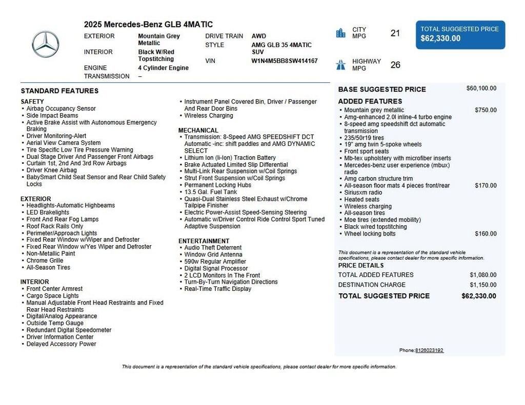 2025 Mercedes-Benz GLB 35 AMG® 4MATIC® We want you to shop confidently for your next used car at The BIG Ford Store, D-Patrick Ford. We are located on Highway 41 and Walnut in Evansville, right next to the Lloyd Expressway. Buy this used vehicle 100% online or in-store. This pre-owned vehicle was put through an extensive inspection before hitting our lot. Because of this, we are able to offer a 3-month/3,000-mile comprehensive limited warranty. You also get our Love It or Return It 5-day, 300-mile Exchange Policy. See our website for more details on both. We also offer extended service plans, vehicle protection plans, and offer a CarFax vehicle history report. *Prices listed do not include a $250 documentation fee, applicable tax, title, tags, license, or $195 service and preparation. All pricing, vehicle information, and features (such as accessories and color) are believed to be accurate, but we do not warrant or guarantee such accuracy. The prices shown above may vary from region to region, and incentives are subject to change. Some offers listed may not be available to all customers. All online sale commitments are subject to confirmation of continued availability of vehicle. Once availability is confirmed, online sale agreement becomes binding upon the parties. If any information found on the website is thought to be erroneous, please verify information with a customer service representative. See dealer for full details. Looking to sell your current vehicle? We buy cars for cash. Every test drive at D-Patrick Ford in Evansville earns $10 to a local charity. Schedule your test drive today! 12 Speakers, 19 AMG® Twin 5-Spoke Wheels, 4-Wheel Disc Brakes, ABS brakes, Adaptive suspension, Air Conditioning, Alloy wheels, AM/FM radio: SiriusXM, Apple CarPlay®/Android Auto®, Auto High-beam Headlights, Automatic temperature control, Brake assist, Bumpers: body-color, Child-Seat-Sensing Airbag, Delay-off headlights, Driver door bin, Driver vanity mirror, Dual front impact airbags, Dual front side impact airbags, Electronic Stability Control, Emergency communication system: eCall Emergency System, Exterior Parking Camera Rear, Four wheel independent suspension, Front anti-roll bar, Front Bucket Seats, Front Center Armrest, Front dual zone A/C, Front fog lights, Front reading lights, Front Sport Seats, Fully automatic headlights, Garage door transmitter, Heated door mirrors, Heated front seats, Heated Seats, Illuminated entry, Knee airbag, Low tire pressure warning, MB-TEX Upholstery w/Microfiber Inserts, Memory seat, Occupant sensing airbag, Outside temperature display, Overhead airbag, Overhead console, Panic alarm, Passenger door bin, Passenger vanity mirror, Power door mirrors, Power driver seat, Power Liftgate, Power moonroof: Panorama, Power passenger seat, Power steering, Power windows, Premium audio system: MBUX, Radio data system, Radio: Mercedes-Benz User Experience (MBUX), Rain sensing wipers, Rear anti-roll bar, Rear fog lights, Rear reading lights, Rear window defroster, Rear window wiper, Remote keyless entry, Security system, SiriusXM Radio, Speed control, Speed-sensing steering, Split folding rear seat, Spoiler, Sport steering wheel, Steering wheel mounted audio controls, Tachometer, Telescoping steering wheel, Tilt steering wheel, Traction control, Trip computer, Turn signal indicator mirrors, Variably intermittent wipers, Wireless Charging. CARFAX One-Owner. Clean CARFAX. 4D Sport Utility 4MATIC® GLB 35 AMG® 8-Speed Automatic I4 4MATIC® Mountain Gray Metallic CALL TODAY (812) 625-4823 OR SHOP ONLINE AT WWW.DPATRICKFORD.COM.