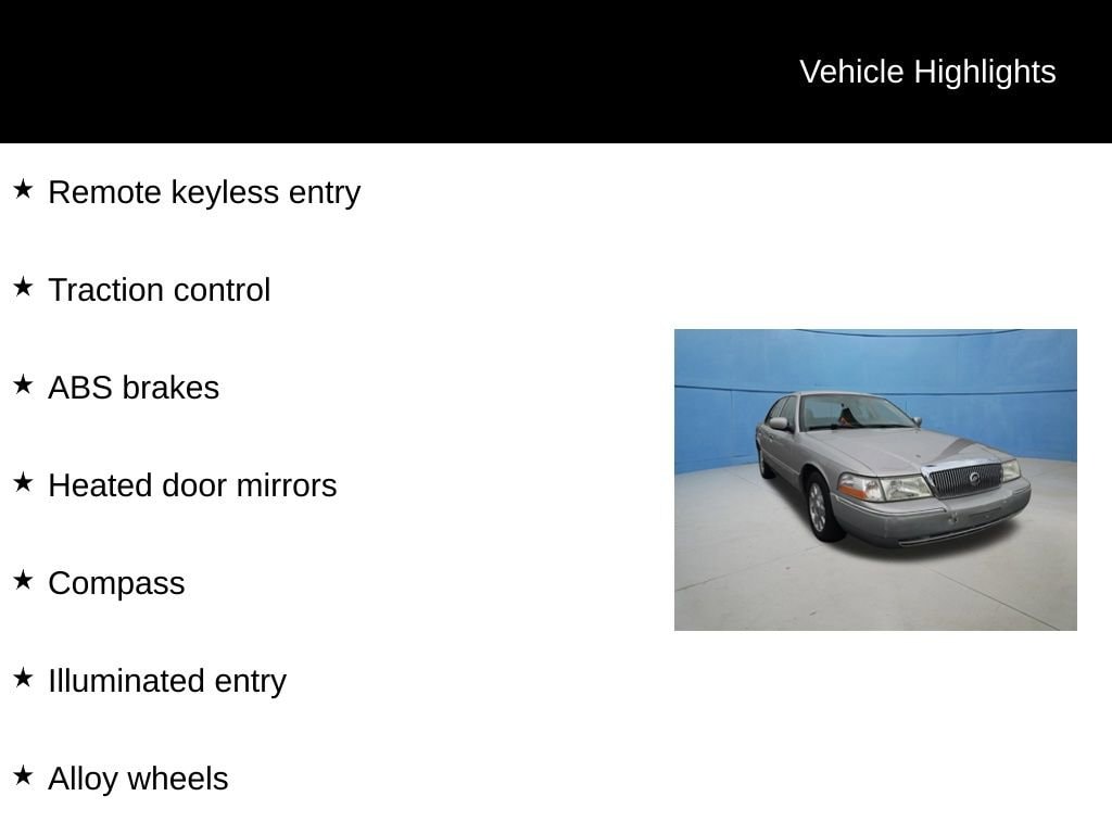 2005 Mercury Grand Marquis LS Recent Arrival! We want you to shop confidently for your next used car at D-Patrick Lebanon Ford and We make it EASY! Buy this used vehicle 100% online or in-store, EASY. Saving time at the dealership, EASY! Financing, EASY! Get pre-approved online or in-store with one of our many lenders, EASY. Finding the car you love at the price you want, EASY! This pre-owned vehicle was put through an extensive inspection before hitting our lot. Because of this, we are able to offer a 3-month/3,000-mile comprehensive limited warranty. You also get our Love It or Return It 5-day, 300-mile Exchange Policy. See our website for more details on both. We also offer extended service plans, vehicle protection plans, and offer a free to you CarFax vehicle history report. *Prices listed do not include a $250 documentation fee, applicable tax, title, tags, license, or $195 service and preparation. All pricing, vehicle information, and features (such as accessories and color) are believed to be accurate, but we do not warrant or guarantee such accuracy. The prices shown above may vary from region to region, and incentives are subject to change. Some offers listed may not be available to all customers. All online sale commitments are subject to confirmation of continued availability of vehicle. Once availability is confirmed, online sale agreement becomes binding upon the parties. If any information found on the website is thought to be erroneous, please verify information with a customer service representative. See dealer for full details. Looking to sell your current vehicle? We buy cars for cash. ABS brakes, Alloy wheels, Compass, Heated door mirrors, Illuminated entry, Remote keyless entry, Traction control. 4D Sedan LS 4-Speed Automatic with Overdrive 4.6L 8-Cylinder SFI SOHC RWD Silver CALL US TODAY BEFORE THIS ONE GETS AWAY-- (765) 204-6248 or shop online at www.dpatricklebanonford.com.