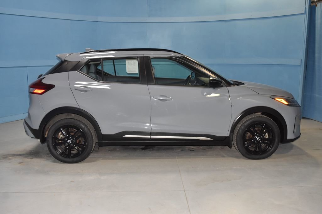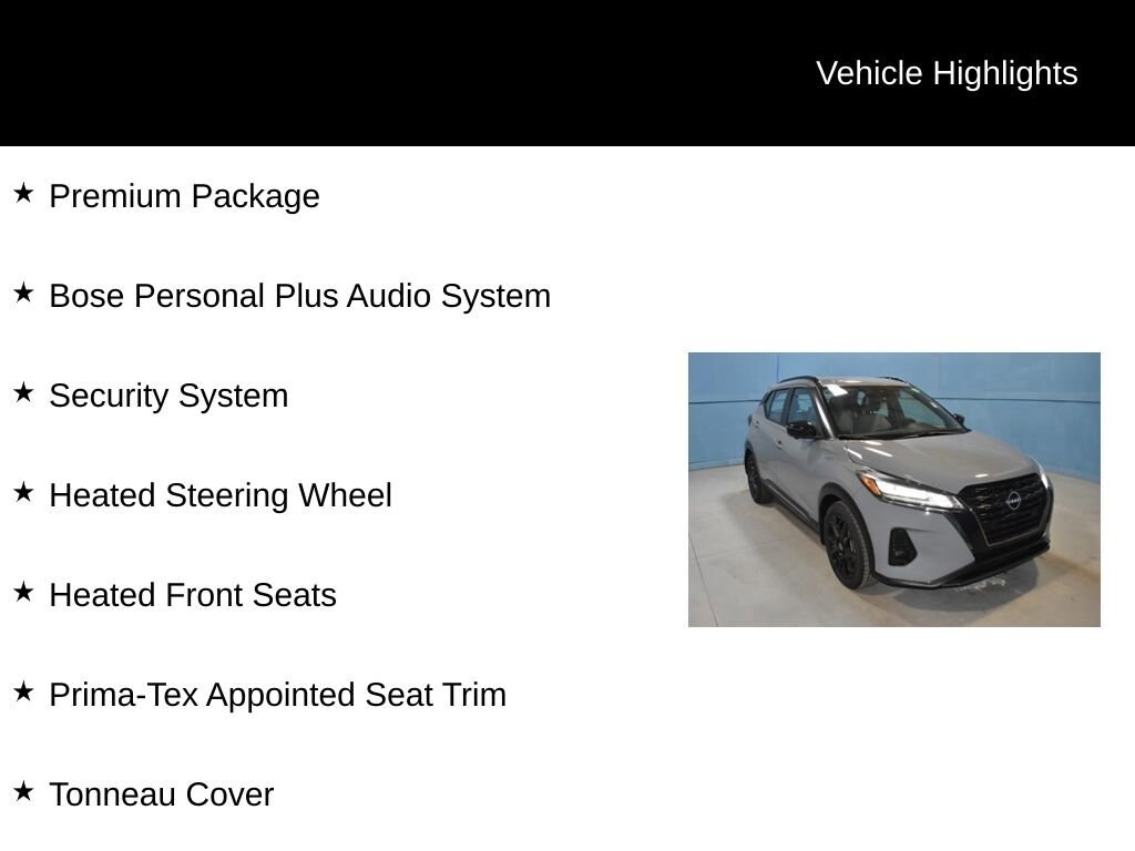 2022 Nissan Kicks SR Premium We want you to shop confidently for your next used car at D-Patrick Nissan. This vehicle also offers extended service plans, vehicle protection plans, and a CarFax vehicle history report. *Prices listed do not include a $250 documentation fee, applicable tax, title, tags, license, or $195 service and preparation. All pricing, vehicle information, and features (such as accessories and color) are believed to be accurate, but we do not warrant or guarantee such accuracy. The prices shown above may vary from region to region, and incentives are subject to change. Some offers listed may not be available to all customers. All online sale commitments are subject to confirmation of continued availability of vehicle. Once availability is confirmed, online sale agreement becomes binding upon the parties. If any information found on the website is thought to be erroneous, please verify information with a customer service representative. See dealer for full details. Looking to sell your current vehicle? We buy cars for cash. Bose Personal Plus Audio System, Heated Front Seats, Heated Steering Wheel, Premium Package, Prima-Tex Appointed Seat Trim, Security System, Tonneau Cover, 3.927 Axle Ratio, 4-Wheel Disc Brakes, 6 Speakers, ABS brakes, Air Conditioning, Alloy wheels, AM/FM radio: SiriusXM, Apple CarPlay/Android Auto, Auto High-beam Headlights, Auto-dimming Rear-View mirror, Automatic temperature control, Blind Spot Warning, Brake assist, Bumpers: body-color, Carpeted Floor Mats w/Cargo Mat, Cloth Seat Trim, Compass, Delay-off headlights, Driver door bin, Driver vanity mirror, Dual front impact airbags, Dual front side impact airbags, Electronic Stability Control, Exterior Parking Camera Rear, Front anti-roll bar, Front Bucket Seats, Front Center Armrest, Front fog lights, Front reading lights, Front wheel independent suspension, Fully automatic headlights, Heated door mirrors, Illuminated entry, Knee airbag, Low tire pressure warning, NissanConnect Services, Occupant sensing airbag, Outside temperature display, Overhead airbag, Panic alarm, Passenger door bin, Passenger vanity mirror, Power door mirrors, Power steering, Power windows, Radio data system, Radio: AM/FM Audio System, Rear Parking Sensors, Rear reading lights, Rear side impact airbag, Rear window defroster, Rear window wiper, Remote keyless entry, Roof rack: rails only, Speed control, Splash Guards Grain (4 Piece), Split folding rear seat, Sport steering wheel, SR Rear Roof Spoiler, Steering wheel mounted audio controls, Tachometer, Technology Package, Telescoping steering wheel, Tilt steering wheel, Traction control, Trip computer, Turn signal indicator mirrors, Variably intermittent wipers, Wheels: 17 5-Hole Alloy, Wheels: 17 Black Alloy, Bose Personal Plus Audio System, Heated Front Seats, Heated Steering Wheel, Premium Package, Prima-Tex Appointed Seat Trim, Security System, Tonneau Cover. Clean CARFAX. 4D Sport Utility Premium SR CVT with Xtronic 1.6L 4-Cylinder DOHC 16V FWD Boulder Gray Pearl CALL TODAY 812-473-6500 and shop online at www.dpatricknissan.com.