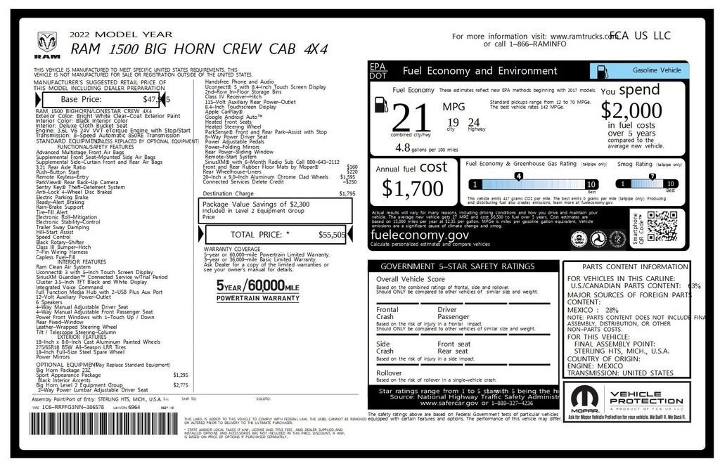• GVWR: 6 900 LBS (STD),BRIGHT WHITE CLEARCOAT,MONOTONE PAINT,TRANSMISSION: 8-SPEED AUTOMATIC (850RE) (STD),REAR UNDERSEAT COMPARTMENT STORAGE,PARKSENSE FRONT/REAR PARK ASSIST W/STOP,CLUSTER 7.0 TFT COLOR DISPLAY,REAR WHEELHOUSE LINERS,QUICK ORDER PACKAGE 23Z BIG HORN -inc: Engine: 3.6L V6 24V VVT eTorque UPG I Transmission: 8-Speed Automatic (850RE) Big Horn Badge,WHEELS: 20 X 9 ALUMINUM CHROME CLAD (WRK),MANUFACTURER'S STATEMENT OF ORIGIN,CONNECTED SERVICES DELETE CREDIT,BLACK DELUXE CLOTH BUCKET SEATS -inc: Power 8-Way Driver Seat Bucket Seats Manual Adjust 4-Way Front Passenger Seat Full Length Floor Console Rear Center Armrest Delete LED Lamp - Floor Console Bin Power 2-Way Driver Lumbar Adjust,ENGINE: 3.6L V6 24V VVT ETORQUE UPG I (STD),MOPAR FRONT & REAR RUBBER FLOOR MATS,TIRES: 275/55R20 OWL ALL SEASON,REMOTE START SYSTEM,RADIO: UCONNECT 5 W W/8.4 DISPLAY,3.21 REAR AXLE RATIO (STD),BIG HORN LEVEL 2 EQUIPMENT GROUP -inc: Google Android Auto SiriusXM Radio Service Bluetooth Handsfree Phone & Audio USB Host Flip Rear Window Defroster For Details Visit DriveUconnect.com Integrated Center Stack Radio ParkSense Front/Rear Park Assist w/Stop Rear View Auto Dim Mirror Power Adjustable Pedals Rear Power Sliding Window Rear Dome w/On/Off Switch Lamp Connectivity - US/Canada Glove Box Lamp 4G LTE Wi-Fi Hot Spot 115V Auxiliary Rear Power Outlet Media Hub w/2 Charge Only USBs Exterior Mirrors w/Heating Element Power 8-Way Driver Seat Auto Dim Exterior Driver Mirror Heated Front Seats Radio: Uconnect 5 W w/8.4 Display Heated Steering Wheel 8.4 Touchscreen Display Class IV Receiver Hitch Security Alarm Black Premium Power Mirrors Apple CarPlay Big Horn IP Badge Remote Start System SiriusXM Satellite Radio Exterior Mirrors w/Supplemental Signals Exterior Mirrors Courtesy Lamps Air Conditioning ATC w/Dual Zone Control 115V Auxiliary Power Out,115V AUXILIARY POWER OUTLET -inc: 400W Inverter,SPORT APPEARANCE PACKAGE -inc: Exterior Mirrors w/Supplemental Signals Body Color Premium Power Mirrors Sport Decal Exterior Mirrors Courtesy Lamps Exterior Mirrors w/Heating Element Auto Dim Exterior Driver Mirror Body Color Exterior Mirrors Black Interior Accents Power-Folding Mirrors Body Color Front Bumper Body Color Rear Bumper w/Step Pads Bridgestone Brand Tires All Plant-Installed Decals,Four Wheel Drive,Tow Hitch,Power Steering,ABS,4-Wheel Disc Brakes,Brake Assist,Lithium Ion Traction Battery,Conventional Spare Tire,Heated Mirrors,Power Mirror(s),Privacy Glass,Intermittent Wipers,Variable Speed Intermittent Wipers,Power Door Locks,Daytime Running Lights,Automatic Headlights,Fog Lamps,AM/FM Stereo,Bluetooth Connection,MP3 Capability,Steering Wheel Audio Controls,Auxiliary Audio Input,Adjustable Steering Wheel,Trip Computer,Power Windows,Pass-Through Rear Seat,Rear Bench Seat,Leather Steering Wheel,Keyless Start,Keyless Entry,Power Door Locks,Cruise Control,A/C,Cloth Seats,Passenger Vanity Mirror,Passenger Illuminated Visor Mirror,Floor Mats,Bluetooth Connection,Power Windows,Power Door Locks,Trip Computer,Immobilizer,Traction Control,Stability Control,Traction Control,Front Side Air Bag,Telematics,Requires Subscription,Tire Pressure Monitor,Driver Air Bag,Passenger Air Bag,Front Head Air Bag,Rear Head Air Bag,Passenger Air Bag Sensor,Child Safety Locks,Back-Up Camera