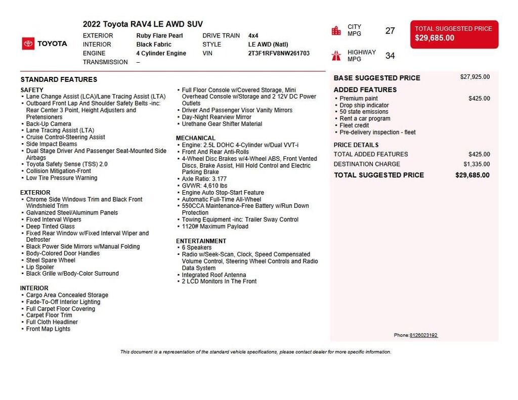 2022 Toyota RAV4 LE We want you to shop confidently for your next used car at The BIG Ford Store, D-Patrick Ford. We are located on Highway 41 and Walnut in Evansville, right next to the Lloyd Expressway. Buy this used vehicle 100% online or in-store. This pre-owned vehicle was put through an extensive inspection before hitting our lot. Because of this, we are able to offer a 3-month/3,000-mile comprehensive limited warranty. You also get our Love It or Return It 5-day, 300-mile Exchange Policy. See our website for more details on both. We also offer extended service plans, vehicle protection plans, and offer a CarFax vehicle history report. *Prices listed do not include a $250 documentation fee, applicable tax, title, tags, license, or $195 service and preparation. All pricing, vehicle information, and features (such as accessories and color) are believed to be accurate, but we do not warrant or guarantee such accuracy. The prices shown above may vary from region to region, and incentives are subject to change. Some offers listed may not be available to all customers. All online sale commitments are subject to confirmation of continued availability of vehicle. Once availability is confirmed, online sale agreement becomes binding upon the parties. If any information found on the website is thought to be erroneous, please verify information with a customer service representative. See dealer for full details. Looking to sell your current vehicle? We buy cars for cash. Every test drive at D-Patrick Ford in Evansville earns $10 to a local charity. Schedule your test drive today! AWD, Cloth, 17 Steel Wheels, 4-Wheel Disc Brakes, 6 Speakers, ABS brakes, Air Conditioning, AM/FM radio: SiriusXM, AM/FM Stereo, Apple CarPlay/Android Auto, Auto High-beam Headlights, Axle Ratio: 3.177, Brake assist, Bumpers: body-color, Driver door bin, Driver vanity mirror, Dual front impact airbags, Dual front side impact airbags, Electronic Stability Control, Emergency communication system: Safety Connect with 1-year trial, Exterior Parking Camera Rear, Fabric Seat Trim, Four wheel independent suspension, Front anti-roll bar, Front Bucket Seats, Front Center Armrest, Front reading lights, Illuminated entry, Knee airbag, Low tire pressure warning, Occupant sensing airbag, Outside temperature display, Overhead airbag, Overhead console, Panic alarm, Passenger door bin, Passenger vanity mirror, Power door mirrors, Power steering, Power windows, Radio data system, Rear anti-roll bar, Rear seat center armrest, Rear window defroster, Rear window wiper, Remote keyless entry, Speed control, Speed-sensing steering, Split folding rear seat, Spoiler, Steering wheel mounted audio controls, Tachometer, Telescoping steering wheel, Tilt steering wheel, Traction control, Trip computer, AWD, Cloth. Clean CARFAX. 4D Sport Utility LE 8-Speed Automatic 2.5L 4-Cylinder DOHC Dual VVT-i AWD Ruby Flare Pearl CALL TODAY (812) 625-4823 OR SHOP ONLINE AT WWW.DPATRICKFORD.COM.