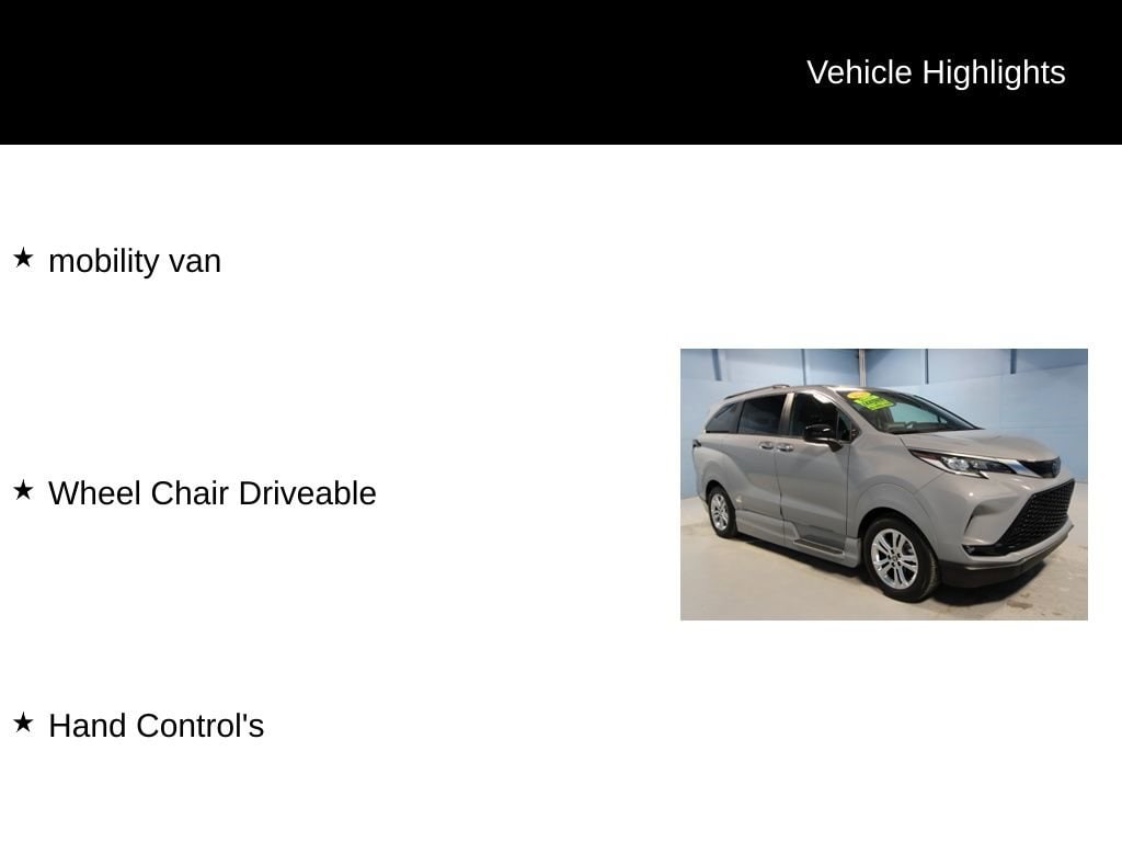 2023 Toyota Sienna XSE 7 Passenger We want you to shop confidently for your next used car at The BIG Ford Store, D-Patrick Ford. We are located on Highway 41 and Walnut in Evansville, right next to the Lloyd Expressway. Buy this used vehicle 100% online or in-store. This pre-owned vehicle was put through an extensive inspection before hitting our lot. Because of this, we are able to offer a 3-month/3,000-mile comprehensive limited warranty. You also get our Love It or Return It 5-day, 300-mile Exchange Policy. See our website for more details on both. We also offer extended service plans, vehicle protection plans, and offer a CarFax vehicle history report. *Prices listed do not include a $250 documentation fee, applicable tax, title, tags, license, or $195 service and preparation. All pricing, vehicle information, and features (such as accessories and color) are believed to be accurate, but we do not warrant or guarantee such accuracy. The prices shown above may vary from region to region, and incentives are subject to change. Some offers listed may not be available to all customers. All online sale commitments are subject to confirmation of continued availability of vehicle. Once availability is confirmed, online sale agreement becomes binding upon the parties. If any information found on the website is thought to be erroneous, please verify information with a customer service representative. See dealer for full details. Looking to sell your current vehicle? We buy cars for cash. Every test drive at D-Patrick Ford in Evansville earns $10 to a local charity. Schedule your test drive today! AWD, 3rd row seats: split-bench, 4-Wheel Disc Brakes, ABS brakes, Air Conditioning, Alloy wheels, AM/FM radio: SiriusXM, Apple CarPlay/Android Auto, Auto High-beam Headlights, Auto-dimming door mirrors, Auto-dimming Rear-View mirror, Automatic temperature control, Axle Ratio: TBA, Brake assist, Bumpers: body-color, Chrome wheels, Compass, Delay-off headlights, Driver door bin, Driver vanity mirror, Driver's Seat Mounted Armrest, Dual front impact airbags, Dual front side impact airbags, Electronic Stability Control, Emergency communication system: Safety Connect (3-year trial), Exterior Parking Camera Rear, Four wheel independent suspension, Front anti-roll bar, Front Bucket Seats, Front dual zone A/C, Front fog lights, Front reading lights, Fully automatic headlights, Garage door transmitter: HomeLink, Heated door mirrors, Heated front seats, Illuminated entry, Knee airbag, Lane Departure Warning System, Leather Shift Knob, Leather steering wheel, Low tire pressure warning, Navigation System, Occupant sensing airbag, Outside temperature display, Overhead airbag, Overhead console, Panic alarm, Passenger door bin, Passenger seat mounted armrest, Passenger vanity mirror, Power door mirrors, Power driver seat, Power Liftgate, Power moonroof, Power passenger seat, Power steering, Power windows, Radio data system, Rear air conditioning, Rear anti-roll bar, Rear dual zone A/C, Rear reading lights, Rear side impact airbag, Rear window defroster, Rear window wiper, Reclining 3rd row seat, Remote keyless entry, Speed control, Speed-sensing steering, Split folding rear seat, Spoiler, Steering wheel mounted audio controls, Tachometer, Telescoping steering wheel, Tilt steering wheel, Traction control, Trip computer, Turn signal indicator mirrors, Variably intermittent wipers, mobility van, Wheel Chair Driveable, Hand Control's, AWD. Clean CARFAX. 4D Passenger Van 7 Passenger XSE CVT 2.5L I4 AWD Silver CALL TODAY (812) 625-4823 OR SHOP ONLINE AT WWW.DPATRICKFORD.COM.
