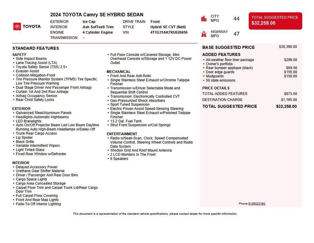 2024 Toyota Camry Hybrid SE We want you to shop confidently for your next used car at The BIG Ford Store, D-Patrick Ford. We are located on Highway 41 and Walnut in Evansville, right next to the Lloyd Expressway. Buy this used vehicle 100% online or in-store. This pre-owned vehicle was put through an extensive inspection before hitting our lot. Because of this, we are able to offer a 3-month/3,000-mile comprehensive limited warranty. You also get our Love It or Return It 5-day, 300-mile Exchange Policy. See our website for more details on both. We also offer extended service plans, vehicle protection plans, and offer a CarFax vehicle history report. *Prices listed do not include a $250 documentation fee, applicable tax, title, tags, license, or $195 service and preparation. All pricing, vehicle information, and features (such as accessories and color) are believed to be accurate, but we do not warrant or guarantee such accuracy. The prices shown above may vary from region to region, and incentives are subject to change. Some offers listed may not be available to all customers. All online sale commitments are subject to confirmation of continued availability of vehicle. Once availability is confirmed, online sale agreement becomes binding upon the parties. If any information found on the website is thought to be erroneous, please verify information with a customer service representative. See dealer for full details. Looking to sell your current vehicle? We buy cars for cash. Every test drive at D-Patrick Ford in Evansville earns $10 to a local charity. Schedule your test drive today! 2.5L I4 DOHC 16V, 4-Wheel Disc Brakes, 6 Speakers, ABS brakes, Air Conditioning, Alloy wheels, AM/FM radio: SiriusXM, Apple CarPlay/Android Auto, Auto High-beam Headlights, Automatic temperature control, Brake assist, Bumpers: body-color, Delay-off headlights, Driver door bin, Driver vanity mirror, Dual front impact airbags, Dual front side impact airbags, Electronic Stability Control, Emergency communication system: Safety Connect (1-year trial), Exterior Parking Camera Rear, Four wheel independent suspension, Front anti-roll bar, Front Bucket Seats, Front Center Armrest, Front dual zone A/C, Front reading lights, Fully automatic headlights, Heated door mirrors, Illuminated entry, Knee airbag, Leather steering wheel, Low tire pressure warning, Occupant sensing airbag, Outside temperature display, Overhead airbag, Overhead console, Panic alarm, Passenger door bin, Passenger vanity mirror, Power door mirrors, Power driver seat, Power steering, Power windows, Radio data system, Radio: Audio, Rear anti-roll bar, Rear reading lights, Rear seat center armrest, Rear side impact airbag, Rear window defroster, Remote keyless entry, Security system, Speed control, Speed-sensing steering, Split folding rear seat, Spoiler, Sport SofTex Seat Trim w/Fabric Inserts, Steering wheel mounted audio controls, Telescoping steering wheel, Tilt steering wheel, Traction control, Trip computer, Turn signal indicator mirrors, Variably intermittent wipers, 2.5L I4 DOHC 16V. CARFAX One-Owner. Clean CARFAX. 4D Sedan SE eCVT 2.5L I4 DOHC 16V FWD White CALL TODAY (812) 625-4823 OR SHOP ONLINE AT WWW.DPATRICKFORD.COM.