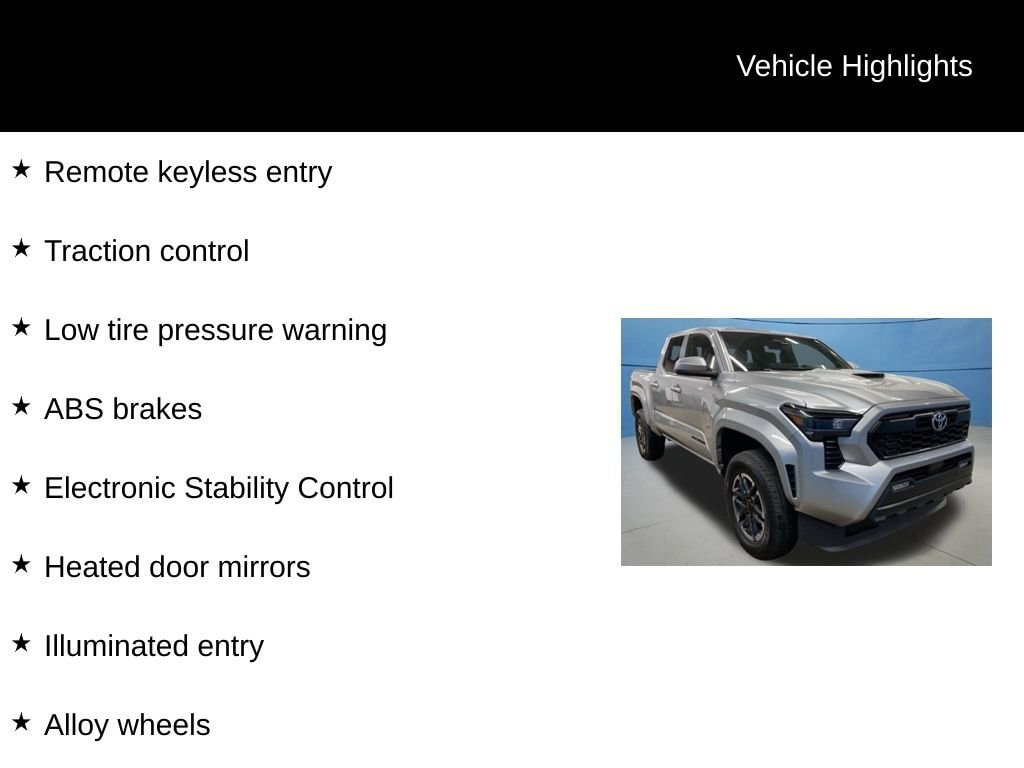 2024 Toyota Tacoma TRD Sport We want you to shop confidently for your next used car at D-Patrick Lebanon Ford and We make it EASY! Buy this used vehicle 100% online or in-store, EASY. Saving time at the dealership, EASY! Financing, EASY! Get pre-approved online or in-store with one of our many lenders, EASY. Finding the car you love at the price you want, EASY! This pre-owned vehicle was put through an extensive inspection before hitting our lot. Because of this, we are able to offer a 3-month/3,000-mile comprehensive limited warranty. You also get our Love It or Return It 5-day, 300-mile Exchange Policy. See our website for more details on both. We also offer extended service plans, vehicle protection plans, and offer a free to you CarFax vehicle history report. *Prices listed do not include a $250 documentation fee, applicable tax, title, tags, license, or $195 service and preparation. All pricing, vehicle information, and features (such as accessories and color) are believed to be accurate, but we do not warrant or guarantee such accuracy. The prices shown above may vary from region to region, and incentives are subject to change. Some offers listed may not be available to all customers. All online sale commitments are subject to confirmation of continued availability of vehicle. Once availability is confirmed, online sale agreement becomes binding upon the parties. If any information found on the website is thought to be erroneous, please verify information with a customer service representative. See dealer for full details. Looking to sell your current vehicle? We buy cars for cash. 4WD, ABS brakes, Alloy wheels, Electronic Stability Control, Heated door mirrors, Illuminated entry, Low tire pressure warning, Remote keyless entry, Traction control. CARFAX One-Owner. 4D Double Cab TRD Sport 6-Speed Manual 2.4L 4-Cylinder 4WD Celestial Silver Metallic CALL US TODAY BEFORE THIS ONE GETS AWAY-- (765) 204-6248 or shop online at www.dpatricklebanonford.com.