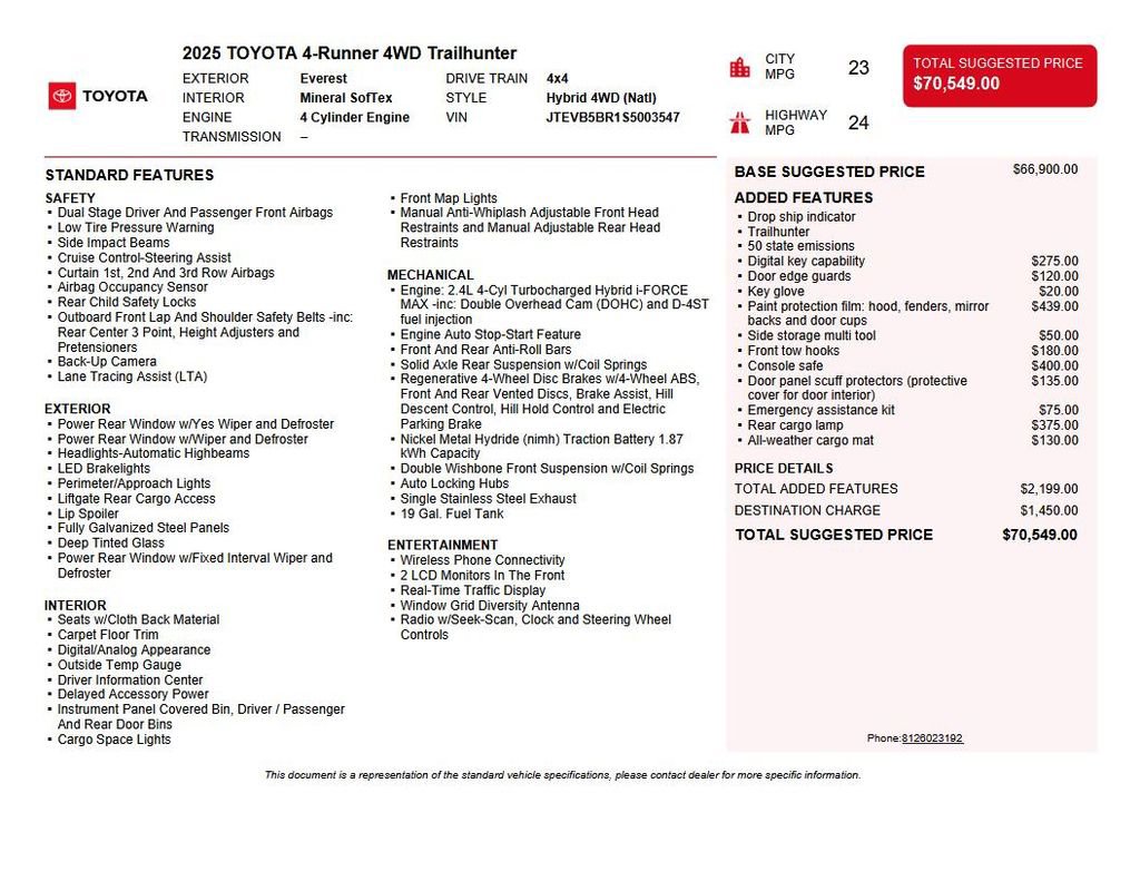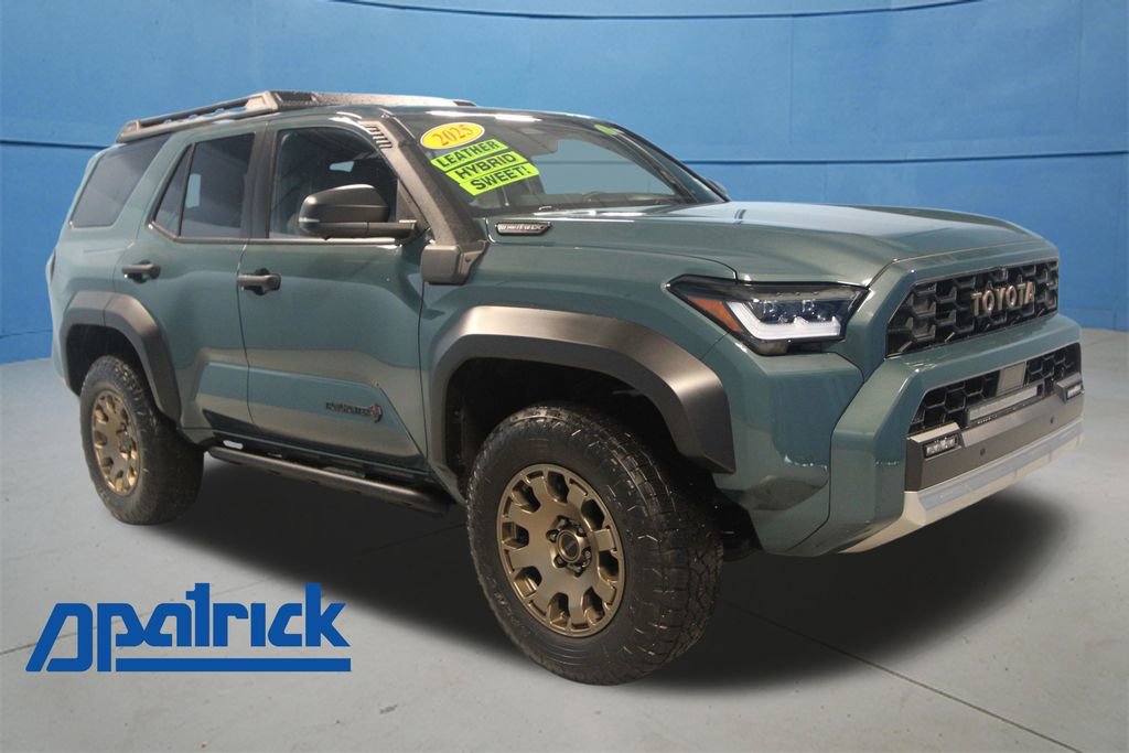 2025 Toyota 4Runner i-FORCE MAX Hybrid Trailhunter Recent Arrival! We want you to shop confidently for your next used car at D-Patrick Lebanon Ford and We make it EASY! Buy this used vehicle 100% online or in-store, EASY. Saving time at the dealership, EASY! Financing, EASY! Finding the car you love at the price you want, EASY! This pre-owned vehicle was put through an extensive inspection before hitting our lot. Because of this, we are able to offer a 3-month/3,000-mile comprehensive limited warranty. You also get our Love It or Return It 5-day, 300-mile Exchange Policy. See our website for more details on both. We also offer extended service plans, vehicle protection plans, and CarFax vehicle history report. *Prices listed do not include a $250 documentation fee, applicable tax, title, tags, license, or $195 service and preparation. All pricing, vehicle information, and features (such as accessories and color) are believed to be accurate, but we do not warrant or guarantee such accuracy. The prices shown above may vary from region to region, and incentives are subject to change. Some offers listed may not be available to all customers. All online sale commitments are subject to confirmation of continued availability of vehicle. Once availability is confirmed, online sale agreement becomes binding upon the parties. If any information found on the website is thought to be erroneous, please verify information with a customer service representative. See dealer for full details. Looking to sell your current vehicle? We buy cars for cash. 2.4L I4 FI Hybrid Turbocharged DOHC 16V, 15 Speakers, 4-Wheel Disc Brakes, 4Runner All Weather Cargo Tray (TMS), ABS brakes, Accessory Ready Multitool (TMS), Air Conditioning, Alloy wheels, AM/FM radio: SiriusXM, Anti-whiplash front head restraints, Apple CarPlay/Android Auto, Auto High-beam Headlights, Automatic temperature control, Brake assist, Bumpers: body-color, Combination Lock Console Safe (TMS), Compass, Digital Key, Driver door bin, Driver vanity mirror, Dual front impact airbags, Dual front side impact airbags, Electronic Stability Control, Emergency Assistance Kit (TMS), Emergency communication system: Safety Connect (1-year trial), Exterior Parking Camera Rear, Front anti-roll bar, Front Bucket Seats, Front Center Armrest, Front Color Keyed Door Edge Guards (TMS), Front dual zone A/C, Front fog lights, Front reading lights, Front Red Tow Hooks Upgrade (TMS), Front wheel independent suspension, Full Coverage Black Eco Key Glove (TMS), Heated & Ventilated Front Bucket Seats, Heated door mirrors, Illuminated entry, Interior D-Pillar Cargo Lights (TMS), Interior Gray Door Panel Protectors (TMS), Knee airbag, Leather Shift Knob, Leather steering wheel, Low tire pressure warning, Memory seat, Navigation System, Occupant sensing airbag, Outside temperature display, Overhead airbag, Overhead console, Panic alarm, Passenger door bin, Passenger vanity mirror, Power door mirrors, Power driver seat, Power passenger seat, Power steering, Power windows, Radio: 14" Audio, Rear anti-roll bar, Rear seat center armrest, Rear side impact airbag, Rear window defroster, Rear window wiper, Remote keyless entry, Security system, SofTex Seat Trim, Speed control, Speed-sensing steering, Split folding rear seat, Spoiler, Steering wheel mounted audio controls, Tachometer, Telescoping steering wheel, Tilt steering wheel, Traction control, Trailhunter, Trip computer, Variably intermittent wipers, Wheels: 18" Bronze-Finished Alloy, 2.4L I4 FI Hybrid Turbocharged DOHC 16V. CARFAX One-Owner. Clean CARFAX. 4D Sport Utility Trailhunter 8-Speed Automatic 2.4L I4 FI Hybrid Turbocharged DOHC 16V 4WD Everest CALL US TODAY BEFORE THIS ONE GETS AWAY-- (765) 204-6248 or shop online at www.dpatricklebanonford.com.