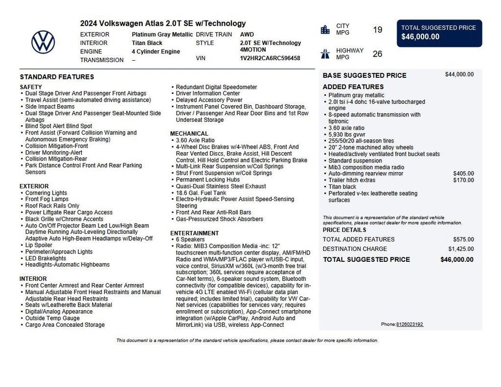 2024 Volkswagen Atlas 2.0T SE w/Technology We want you to shop confidently for your next used car at The BIG Ford Store, D-Patrick Ford. We are located on Highway 41 and Walnut in Evansville, right next to the Lloyd Expressway. Buy this used vehicle 100% online or in-store. This pre-owned vehicle was put through an extensive inspection before hitting our lot. Because of this, we are able to offer a 3-month/3,000-mile comprehensive limited warranty. You also get our Love It or Return It 5-day, 300-mile Exchange Policy. See our website for more details on both. We also offer extended service plans, vehicle protection plans, and offer a CarFax vehicle history report. *Prices listed do not include a $250 documentation fee, applicable tax, title, tags, license, or $195 service and preparation. All pricing, vehicle information, and features (such as accessories and color) are believed to be accurate, but we do not warrant or guarantee such accuracy. The prices shown above may vary from region to region, and incentives are subject to change. Some offers listed may not be available to all customers. All online sale commitments are subject to confirmation of continued availability of vehicle. Once availability is confirmed, online sale agreement becomes binding upon the parties. If any information found on the website is thought to be erroneous, please verify information with a customer service representative. See dealer for full details. Looking to sell your current vehicle? We buy cars for cash. Every test drive at D-Patrick Ford in Evansville earns $10 to a local charity. Schedule your test drive today! 3.60 Axle Ratio, 3rd row seats: split-bench, 4-Wheel Disc Brakes, 6 Speakers, ABS brakes, Air Conditioning, Alloy wheels, AM/FM radio: SiriusXM with 360L, Auto-Dimming Rear-View Mirror, Auto-dimming Rear-View mirror, Automatic temperature control, Brake assist, Bumpers: body-color, Carpeted Mats - Bench Seats (DISC), Compass, Delay-off headlights, Driver door bin, Driver vanity mirror, Dual front impact airbags, Dual front side impact airbags, Electronic Stability Control, Emergency communication system: VW Car-Net Safe & Secure 5-year, Exterior Parking Camera Rear, Four wheel independent suspension, Front anti-roll bar, Front Bucket Seats, Front Center Armrest, Front dual zone A/C, Front fog lights, Front reading lights, Fully automatic headlights, Heated door mirrors, Heated front seats, Heated steering wheel, Heated/Actively Ventilated Front Bucket Seats, Illuminated entry, Low tire pressure warning, Occupant sensing airbag, Outside temperature display, Overhead airbag, Overhead console, Panic alarm, Passenger door bin, Passenger vanity mirror, Perforated V-Tex Leatherette Seating Surfaces, Power door mirrors, Power driver seat, Power Liftgate, Power steering, Power windows, Radio data system, Radio: MIB3 Composition Media, Rain sensing wipers, Rear air conditioning, Rear anti-roll bar, Rear reading lights, Rear seat center armrest, Rear window defroster, Rear window wiper, Remote keyless entry, Security system, Speed control, Speed-sensing steering, Split folding rear seat, Spoiler, Standard Suspension, Steering wheel mounted audio controls, Tachometer, Telescoping steering wheel, Tilt steering wheel, Traction control, Trip computer, Turn signal indicator mirrors, Variably intermittent wipers, Ventilated front seats, VW Care, Wheels: 20 2-Tone Machined Alloy. CARFAX One-Owner. 4D Sport Utility 2.0T SE w/Technology 8-Speed Automatic with Tiptronic 2.0L TSI AWD Platinum Gray Metallic CALL TODAY (812) 625-4823 OR SHOP ONLINE AT WWW.DPATRICKFORD.COM.