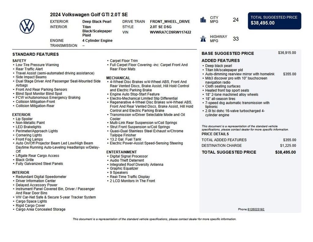 2024 Volkswagen Golf GTI 2.0T SE Recent Arrival! **Prices listed do not include a $250 documentation fee, applicable tax, title, tags, license, or $195 service and preparation. All pricing, vehicle information, and features (such as accessories and color) are believed to be accurate, but we do not warrant or guarantee such accuracy. The prices shown above may vary from region to region, and incentives are subject to change. Some offers listed may not be available to all customers. All online sale commitments are subject to confirmation of continued availability of vehicle. Once availability is confirmed, online sale agreement becomes binding upon the parties. If any information found on the website is thought to be erroneous, please verify information with a customer service representative. See dealer for full details. 4-Wheel Disc Brakes, 9 Speakers, ABS brakes, Air Conditioning, Alloy wheels, AM/FM radio: SiriusXM with 360L, Auto-dimming Rear-View mirror, Automatic temperature control, Brake assist, Bumpers: body-color, Cloth Seating Surfaces, Compass, Delay-off headlights, Driver door bin, Driver vanity mirror, Dual front impact airbags, Dual front side impact airbags, Electronic Stability Control, Emergency communication system: VW Car-Net Safe & Secure 5-year, Exterior Parking Camera Rear, Forward collision: FCW w/Autonomous Emergency Braking mitigation, Four wheel independent suspension, Front anti-roll bar, Front Bucket Seats, Front Center Armrest, Front fog lights, Front reading lights, Fully automatic headlights, harman/kardon® Speakers, Heated door mirrors, Heated front seats, Heated Front Top Sport Seats, Heated steering wheel, Illuminated entry, Lane Departure Warning System, Leather steering wheel, Low tire pressure warning, Navigation System, Occupant sensing airbag, Outside temperature display, Overhead airbag, Overhead console, Panic alarm, Passenger door bin, Passenger vanity mirror, Power door mirrors, Power driver seat, Power moonroof: Panoramic, Power passenger seat, Power steering, Power windows, Radio data system, Radio: MIB3 Discover Pro w/10 Touchscreen Navi, Rain sensing wipers, Rear anti-roll bar, Rear reading lights, Rear seat center armrest, Rear window defroster, Rear window wiper, Remote keyless entry, Security system, Speed control, Speed-sensing steering, Speed-Sensitive Wipers, Split folding rear seat, Spoiler, Sport steering wheel, Steering wheel mounted audio controls, Tachometer, Telescoping steering wheel, Tilt steering wheel, Traction control, Trip computer, Turn signal indicator mirrors, Variably intermittent wipers, Wheels: 18 2-Tone Machined Alloy. CARFAX One-Owner. Clean CARFAX. 4D Hatchback 2.0T SE 7-Speed DSG Automatic with Tiptronic 2.0L TSI DOHC FWD Black (812) 477-6201 and shop online at www.dpathonda.com.